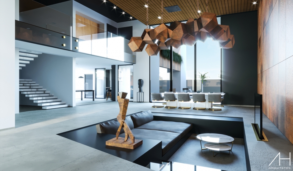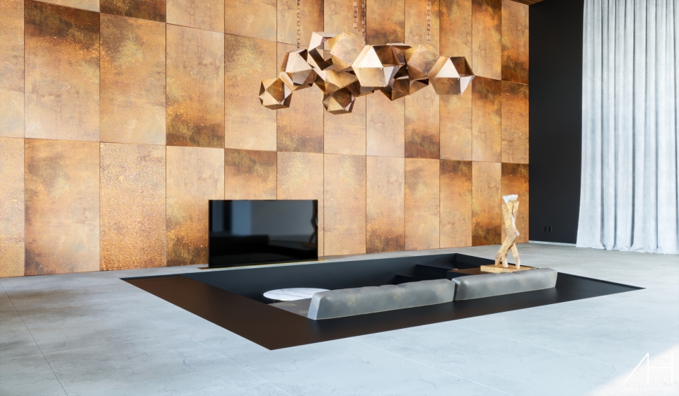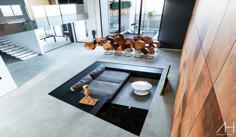 Na área interna da edificação, o aço Corten faz parte da decoração nos ambientes, sendo utilizado de várias formas. A sala possui pé-direito duplo e, atrás do home theater, a parede foi toda revestida com aço Corten, o que dá grande destaque a mesma. Outro detalhe marcante é o uso de objetos de decoração e o pendente com cabos de aço elaborados em aço Corten.