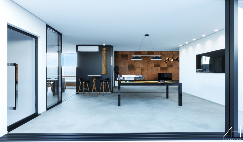 Na fachada, a sacada em balanço com o uso da textura do aço Corten, a massa branca e preta e os grandes vãos em vidro dão ao projeto um caráter modernista.