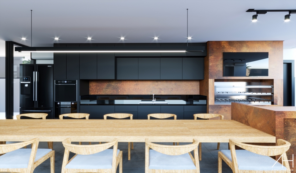 Na área posterior, o aço Corten deu origem a um detalhe na parede, que ao mesmo tempo funciona como uma floreira, o que deixa o ambiente com um ar sofisticado e integrado à natureza.