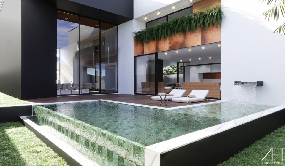 A piscina com borda infinita enriquece o projeto e transmite a sensação de amplitude ao visualizar o horizonte.